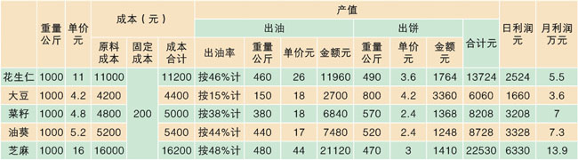 2. 出油率:每百斤出14斤油,油單價(jià):5元/斤